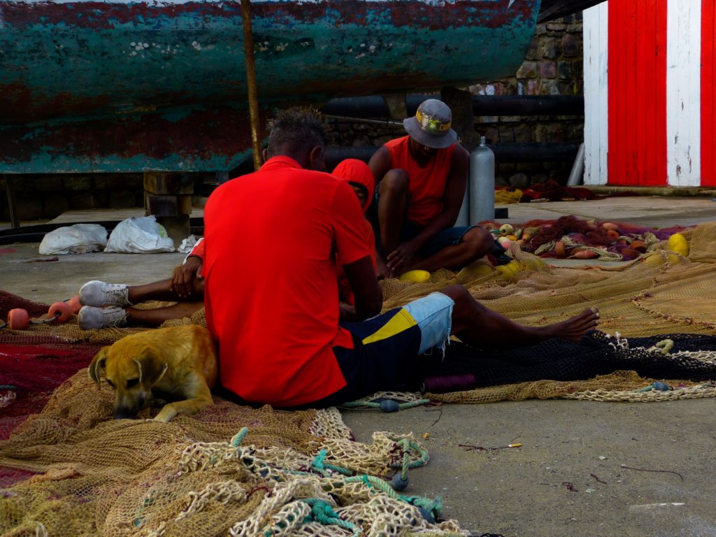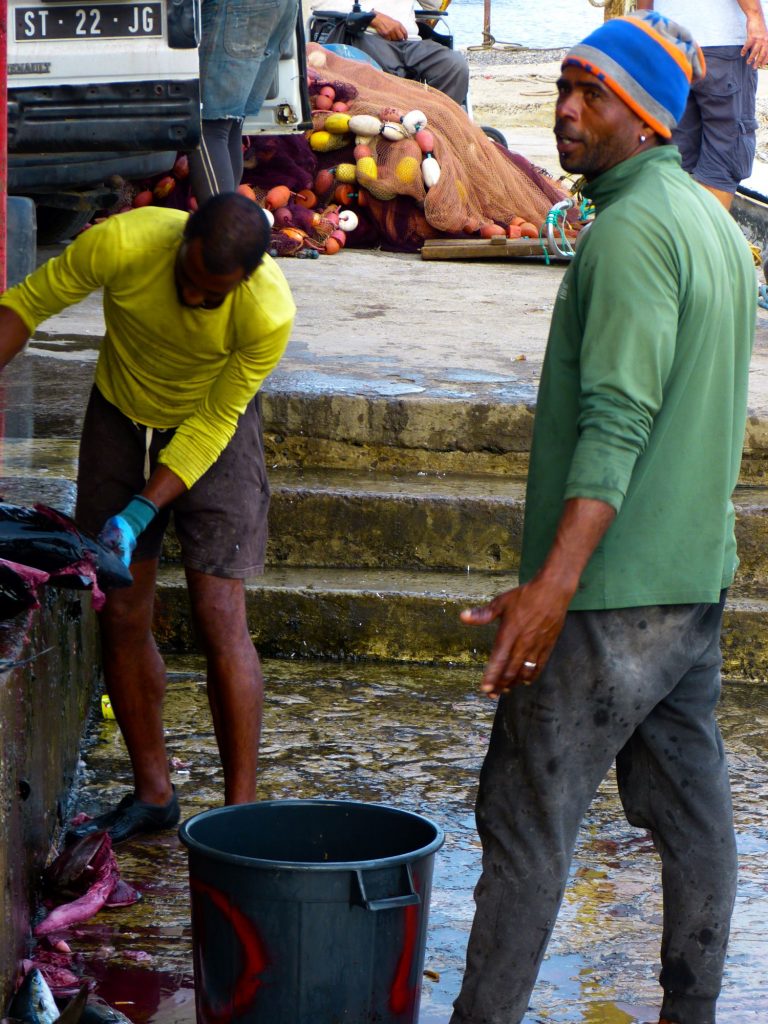 Palmeira – Sal Kildir, le voilier québécois, est arrivé à Palmeira. Je les rejoins pour passer quelques jours ensemble. Formalités obligatoires et accueil de la police maritime et de l’immigration fort sympathique. Et puis rencontre avec Ronaldo et son amie Clara : un couple qui voyage en bateau stoppe…….Leur objectif : Le Brésil. Sur le quai du port, les pêcheurs vident les poisons ou reprisent les filets….