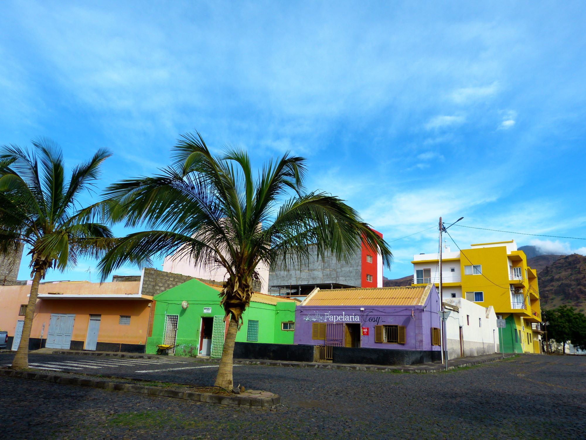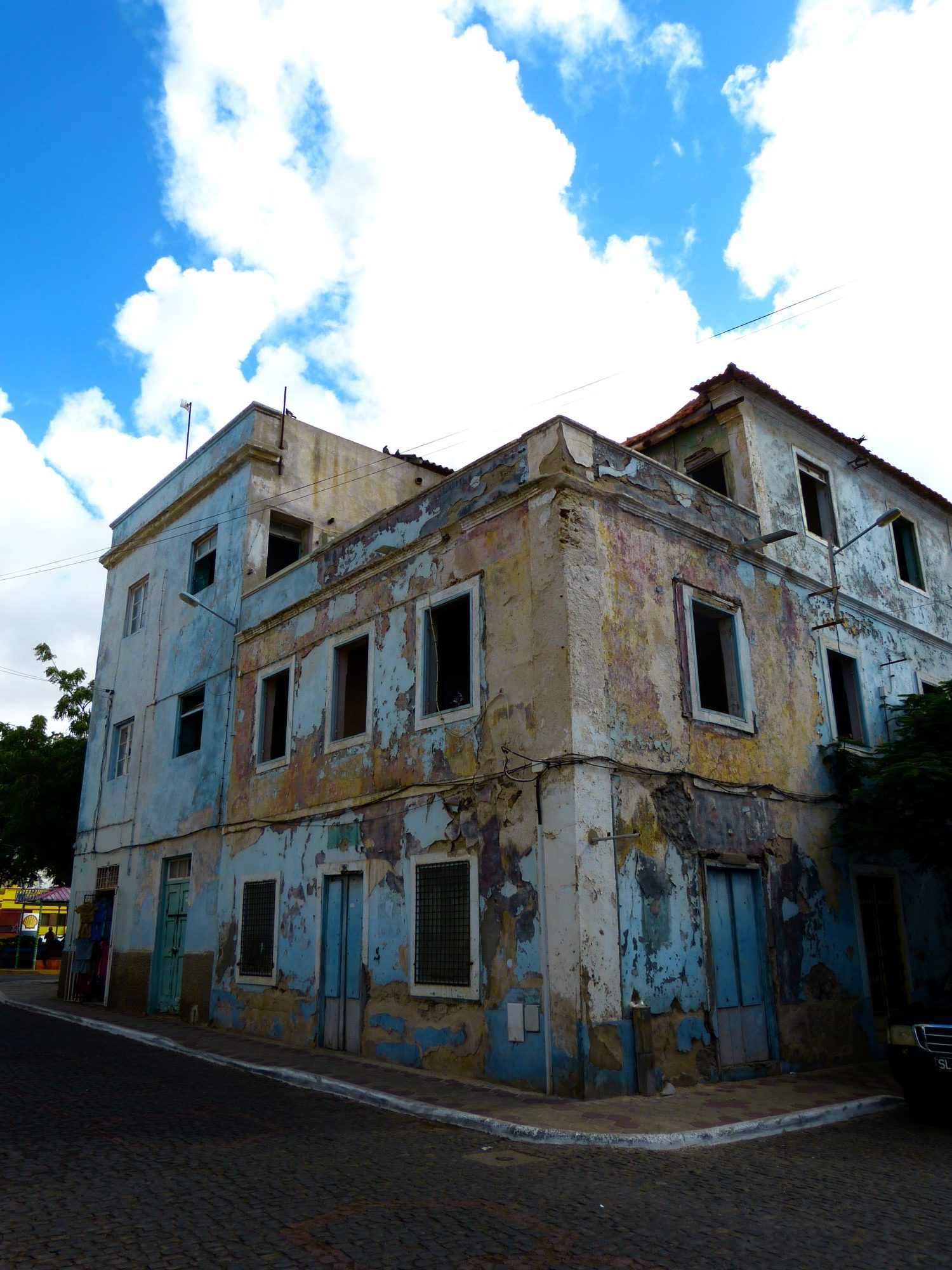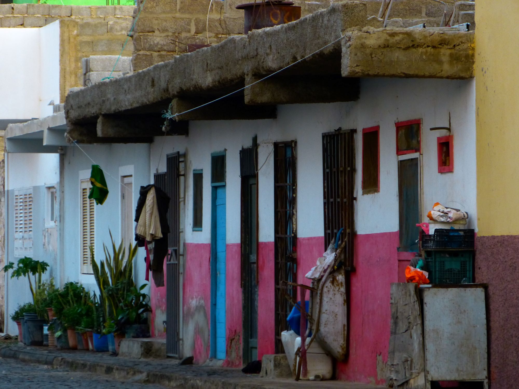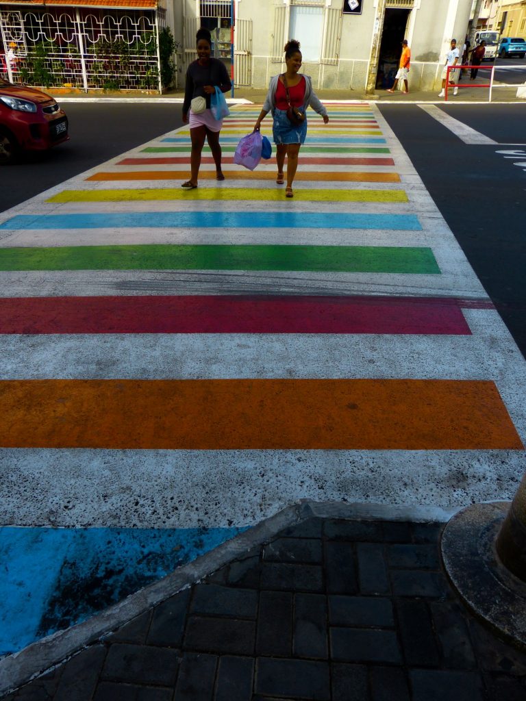 Mindelo c’est aussi une ville où la couleur prédomine …..jusqu’aux passages pour piétons…..entre des façades quelques peu délabrées.