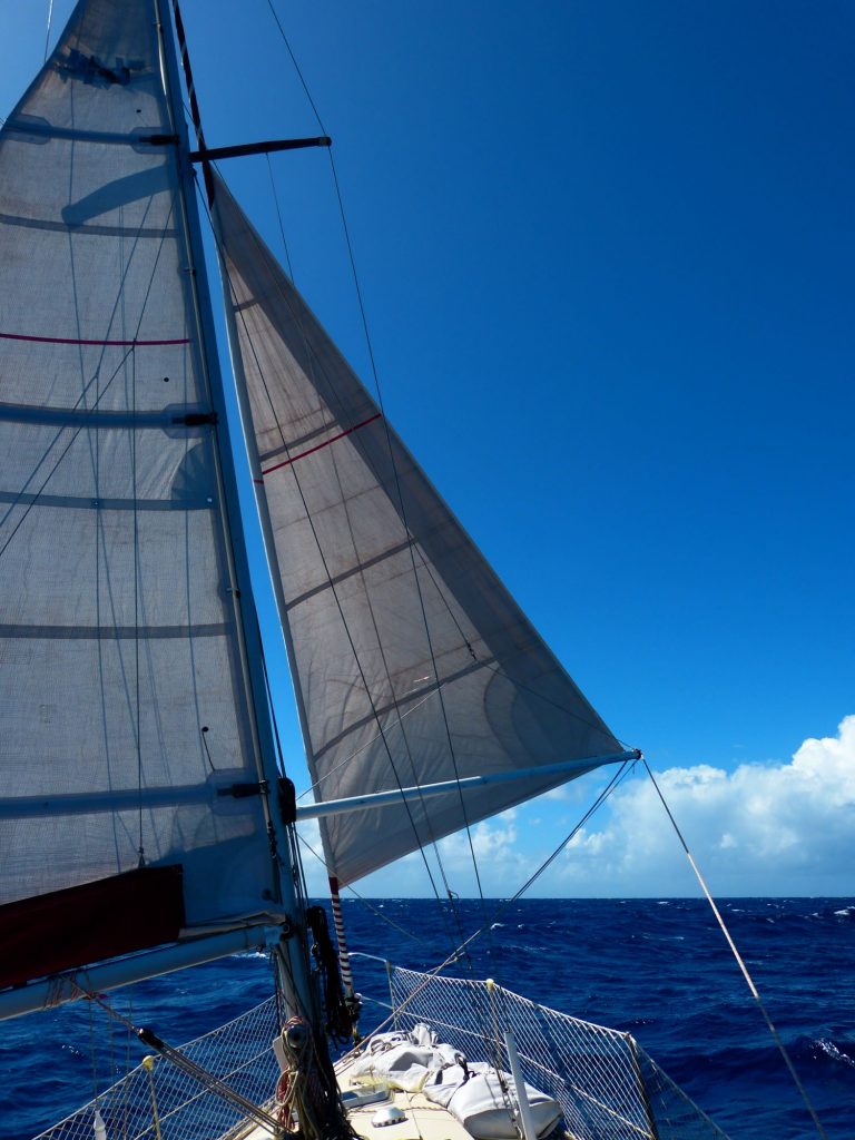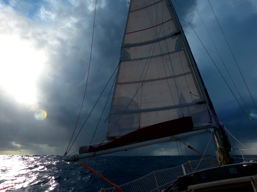 13h40 : C’est humide mais cela s’éclaircit un peu. Je mange les poissons volants tombés sur le pont : du frais !!! Et le temps est agréable. J’ai hissé la Grand Voile : réparations non convaincantes. On verra.